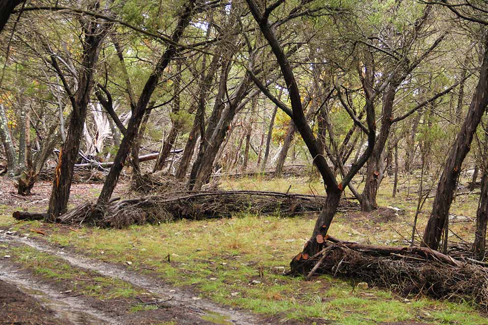 Cedar trees or juniper trees, also are very slow to grow in high areas of the hill country of Texas, and provide food for certain species, great wind breakers, provide shade and improve the soil, therefore is best not to kill them, but simply trim them!